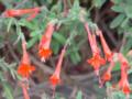 The California Fuchsia, Zauschneria californica, or Epilobium canum to give it's more recent name, is a native of the offshore islands of southern California, including Santa Catalina. It blooms in the peak of summer, continuing into the autumn. It grows in a thick clump. It spreads by underground runners, and thereby tends to invade its neighbors. (Photo October 2003)