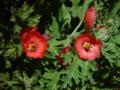 The Desert Mallow, Sphaeralcea munroana, is found in the desert areas of southern California. It is a many-stemmed plant that tends to spread out, with many orange flowers along the stems. It flowers for quite a long time, beginning around the end of March, and is a good cut flower. (Photo April 2004)