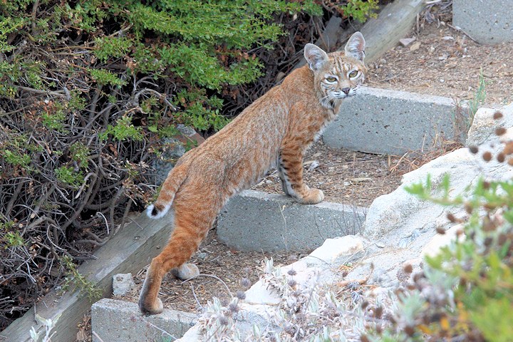 We saw this bobcat while we were eating dinner on our back deck in the late summer afternoon. The bobcat came down the back hill, across the bridge, up the garden stairs, around the side of the house, out into the street, then disappeared into the shrubbery of the yard opposite. This is one of the most brightly colored bobcats that we've seen.