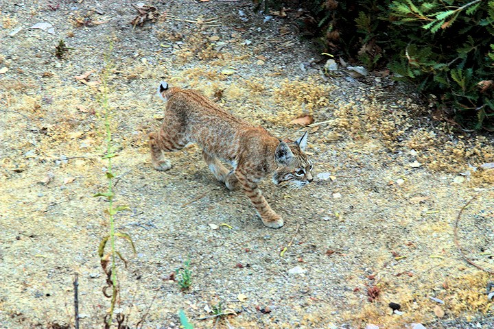 We saw this bobcat while we were eating dinner on our back deck in the late summer afternoon. The bobcat came down the back hill, across the bridge, up the garden stairs, around the side of the house, out into the street, then disappeared into the shrubbery of the yard opposite. This is one of the most brightly colored bobcats that we've seen.