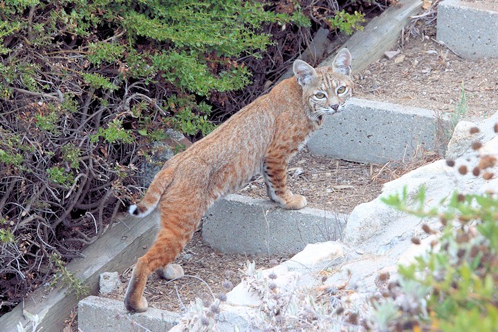 We saw this bobcat while we were eating dinner on our back deck in the late summer afternoon. The bobcat came down the back hill, across the bridge, up the garden stairs, around the side of the house, out into the street, then disappeared into the shrubbery of the yard opposite. This is one of the most brightly colored bobcats that we've seen.