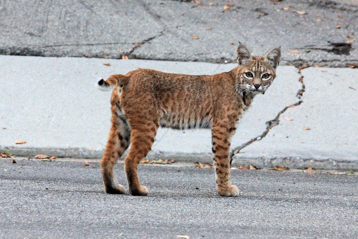 We saw this bobcat while we were eating dinner on our back deck in the late summer afternoon. The bobcat came down the back hill, across the bridge, up the garden stairs, around the side of the house, out into the street, then disappeared into the shrubbery of the yard opposite. This is one of the most brightly colored bobcats that we've seen.