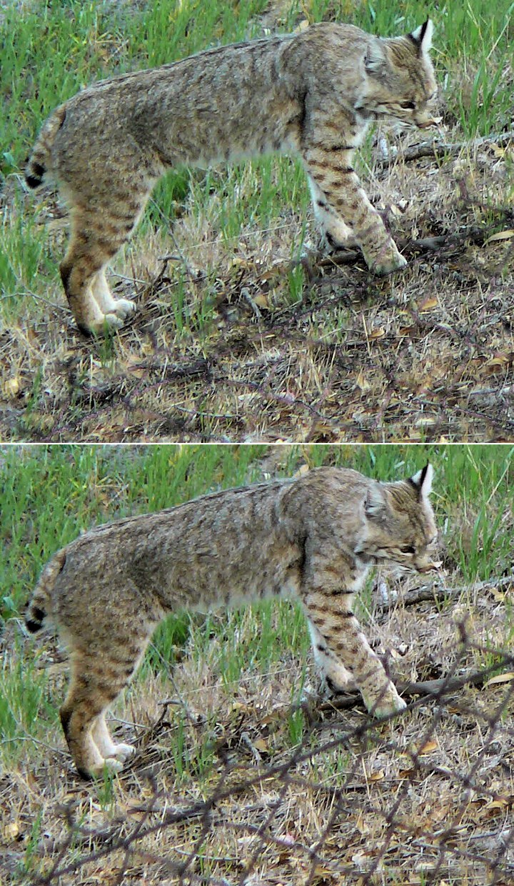 14 March 2007. Our neighbor, Jim, is a physicist. These images show two versions of the one photo, where the bobcat is adjacent to the fallen chain-link fence. The lower version of the photo is the original. The upper version shows what Jim achieved using fourier filtering to remove the chain-link fence with its regular pattern of wire, — a significantly successful effort.